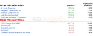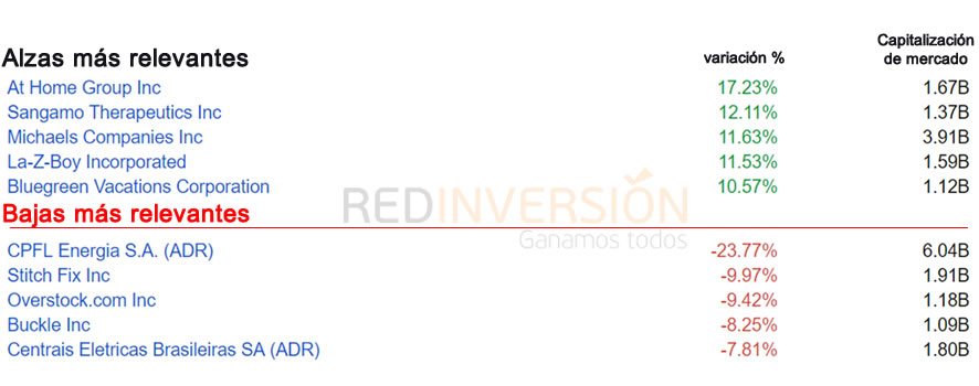 Resultados del Día Resultados del día al 30 de noviembre del 2017 30/11/2017 Juan Pablo Navarrete 0 comentarios Resultados del día de hoy: Resultado Precio Variación Variación % Dow Jones 24272,35 331,67 1,39% S&P 500 2647,58 21,51 0,82% Nasdaq 6365,56 54,19 0,86% Principales tendencias del día en acciones Tendencias del S&P500 Gentileza de TD Ameritrade